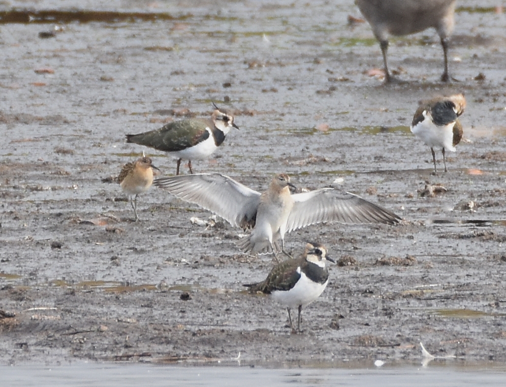 The time had now come for us to get on with our family stuff so we had leave but we did call in at the first screen again to check on the Grey Partridges. They weren't there but there was an enormous flock of several thousand Pink Footed Geese in the distance probably over the Formby mosses, it was gazing at these we noticed the Lapwings were up over the other pool. But what was that white thing with them getting grief from a Lapwing? At first glance it looked like one of those white Feral Pigeons rather than a gull but closer inspection revealed it to be a leucistic Lapwing and what a beauty it was too with it's black wingtips - wish we'd noticed it on the deck with all the other Lapwings - what a cracking looking bird! Apparently there is another less striking leucistic Lapwing too.