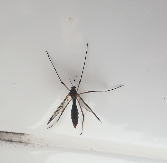 With not much happening we took ourselves back indoors for a brew where we found this crane fly bouncing around the kitchen window trying to smash the panes of glass to get out. Once it had come to rest we saw that it wasn't one of your 'normal' types of Crane Fly but from the family of Fold Winged Flies, Ptychopteridae.