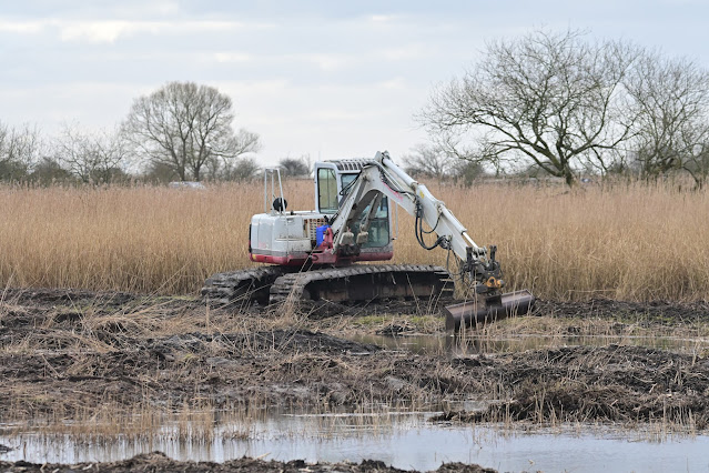 At Lillian's Hide there was some significant disturbance going on. A very interesting piece of kit was out on the water cutting reeds. If you remember from our previous blog we mentioned that big animals provided a habitat mangement service at the landscape scale in the very old days and nowadays we almost always have to use proxy domesticated, but hardy, animals for this job although we doubt if the now extinct Aurochs nor, still with us but sadly not in Britian, Moose would be able to make the inroads into the reedbed like this machine can. We assume it's making deeper channels through the reeds to allow fish to penetrate further into the reedbed where Bitterns can catch them without coming out into more open areas which they don't particularly like to do.