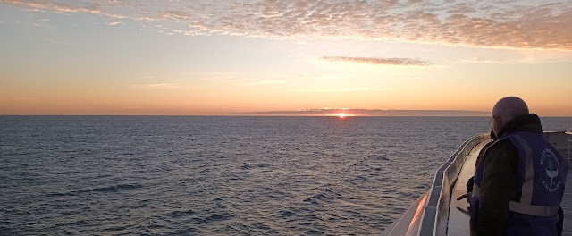The following day was cooler with some cloud and a sea state 4, lots of white horses making spotting dolphin splashes difficult to see and the wind moving whale blows around making them difficult to discern as from which species they came. It was a long slow day that improved as the afternoon turned to evening, although guests had reported both dolphins (probably White Beaked Dolphins) and a Minke Whale before breakfast. Our notebook says we had a Humpback Whale at lunchtime and Sperm Whales and Fin Whale blows after dinner. Birdwise it was shearwaters again. The Big Four had been reduced to a Big Two as there were far fewer Puffins and only a couple of Gannets seen all day. We spotted a distatnt petrel which can only have been a Leach's Petrel up this way. IH found a flock of 'probable' Grey Phalaropes and AB saw a juvenile Sabine's Gull. A Dunlin called as it flew round the ship a couple of times without landing and a flock of Golden Plovers went past us early in the morning. Another lost Black Headed Gull was also seen. Once again the day belonged to the shearwaters and now we were a bit further south Great Shearwaters were by far the most numerous.